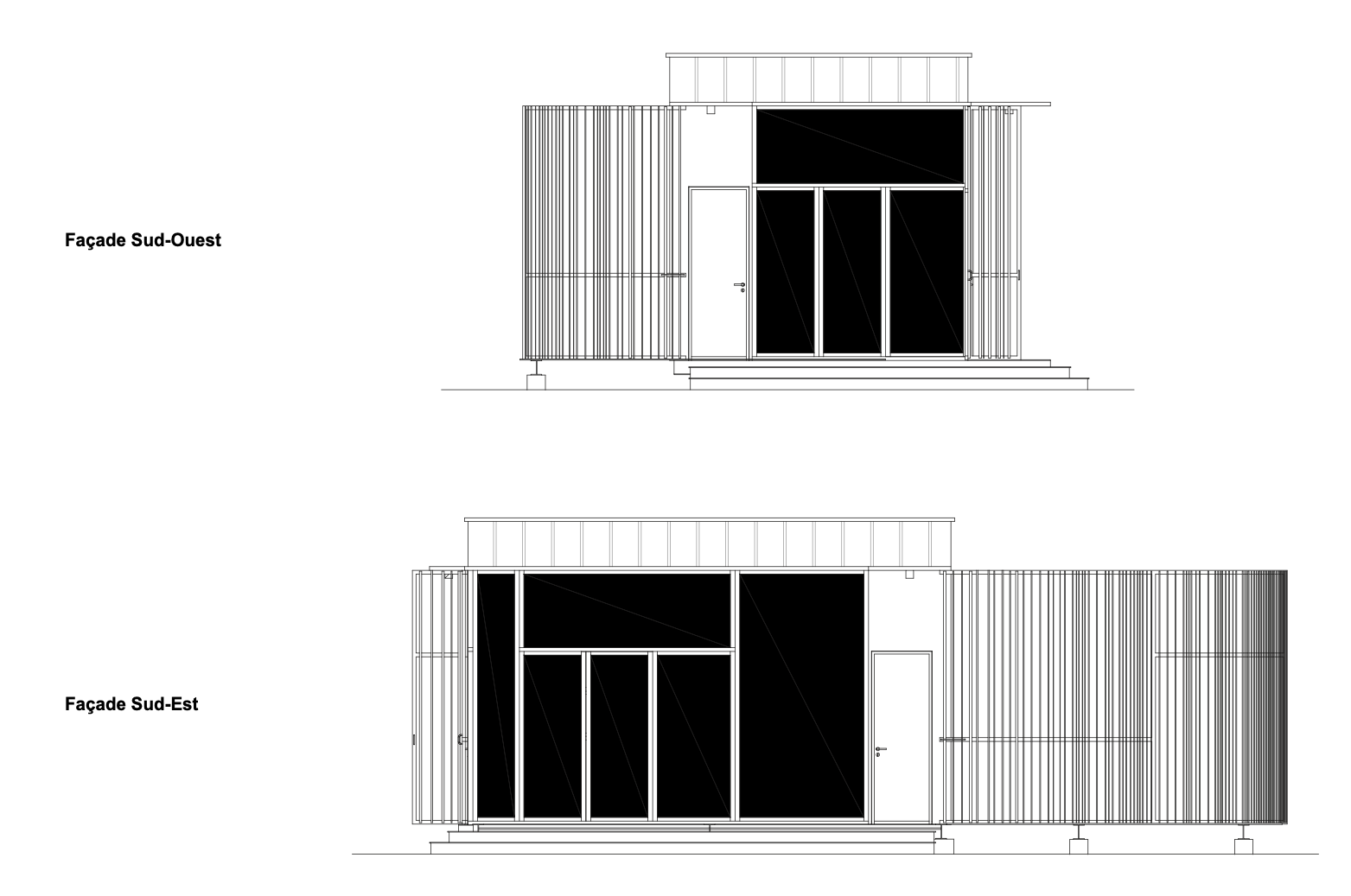 Compact and rigorously proportioned, the simple volume features a wide glazed façade screened by vertical metal louvers, creating a subtle play between transparency, light, and intimacy.