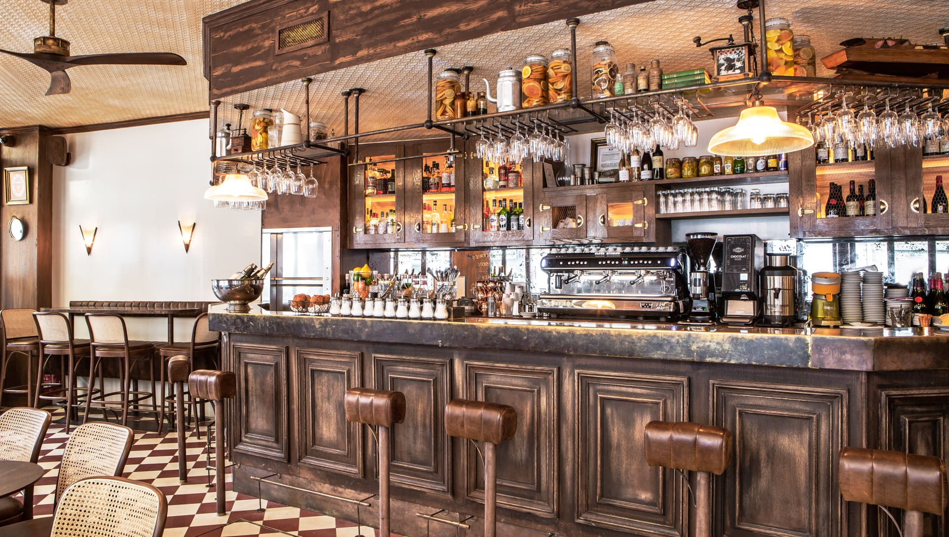 The color palette is warm and inviting—vanilla marble, sandblasted oak, chocolate and white checkerboard tiles. Upon entering, the scent of coffee fills the air. Beneath a brass-and-glass bar canopy, custom-designed stools resemble miniature pommel horses, inviting guests to linger in conversation.