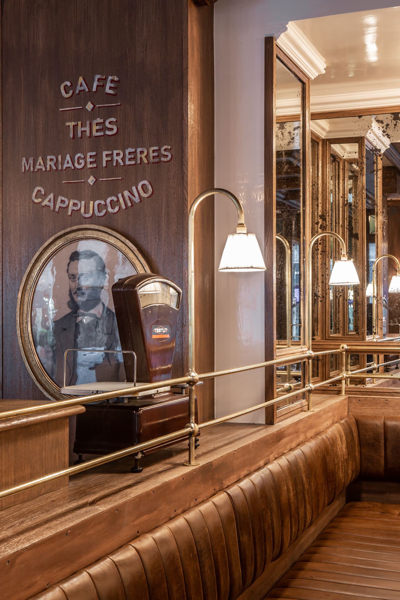 DODA.A reimagined the space in the spirit of the traditional Parisian café, using aged materials and patinated surfaces to evoke timeless charm: weathered parquet, vintage leather, foxed mirrors, and antique brass accents.