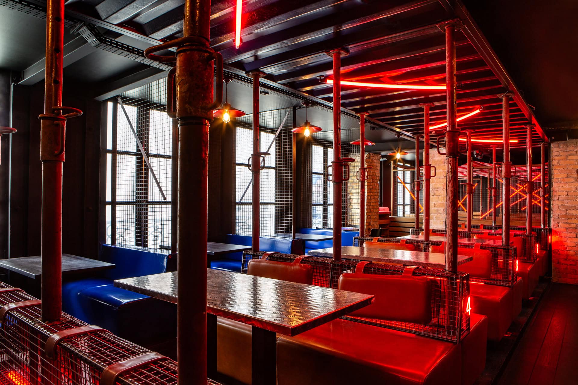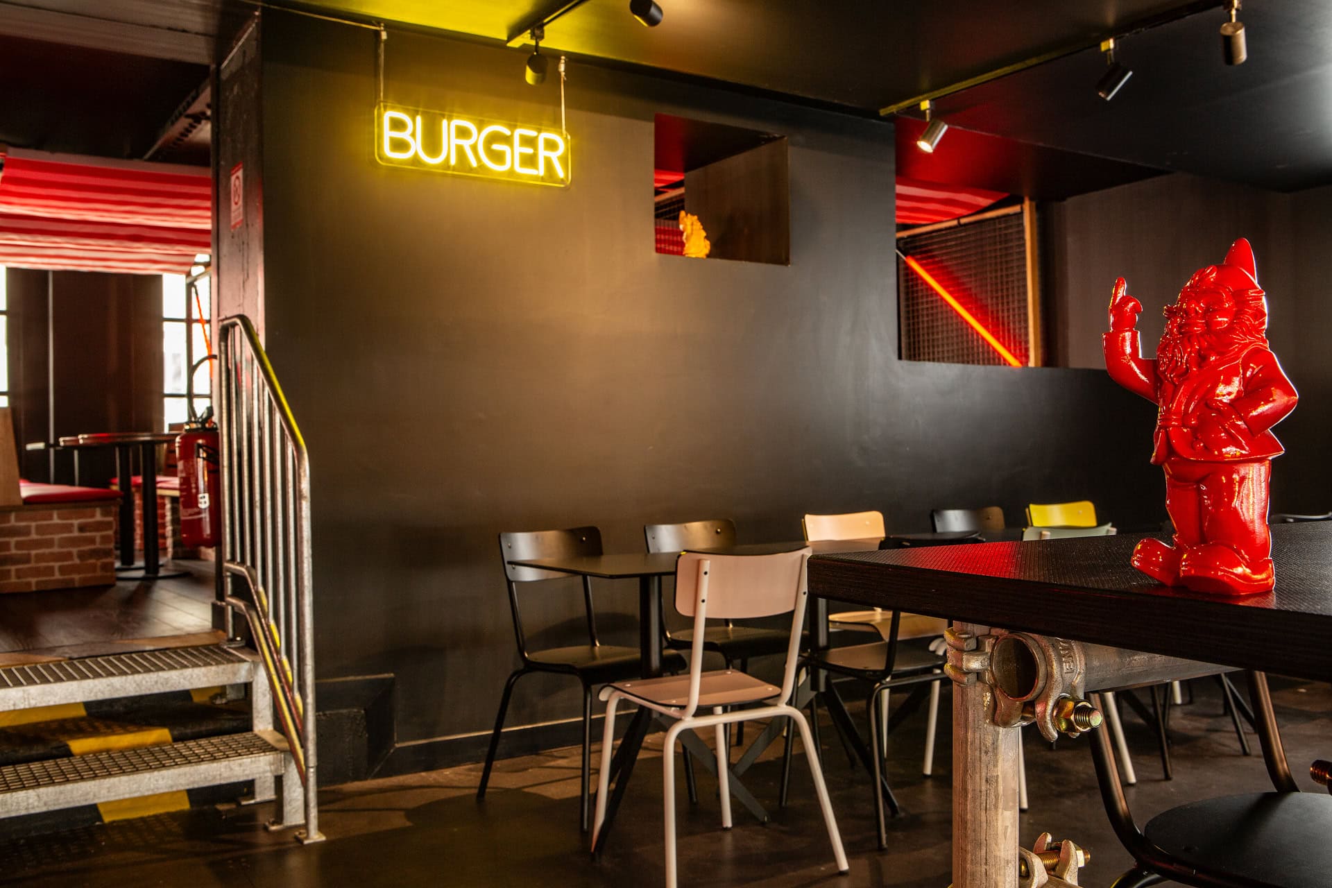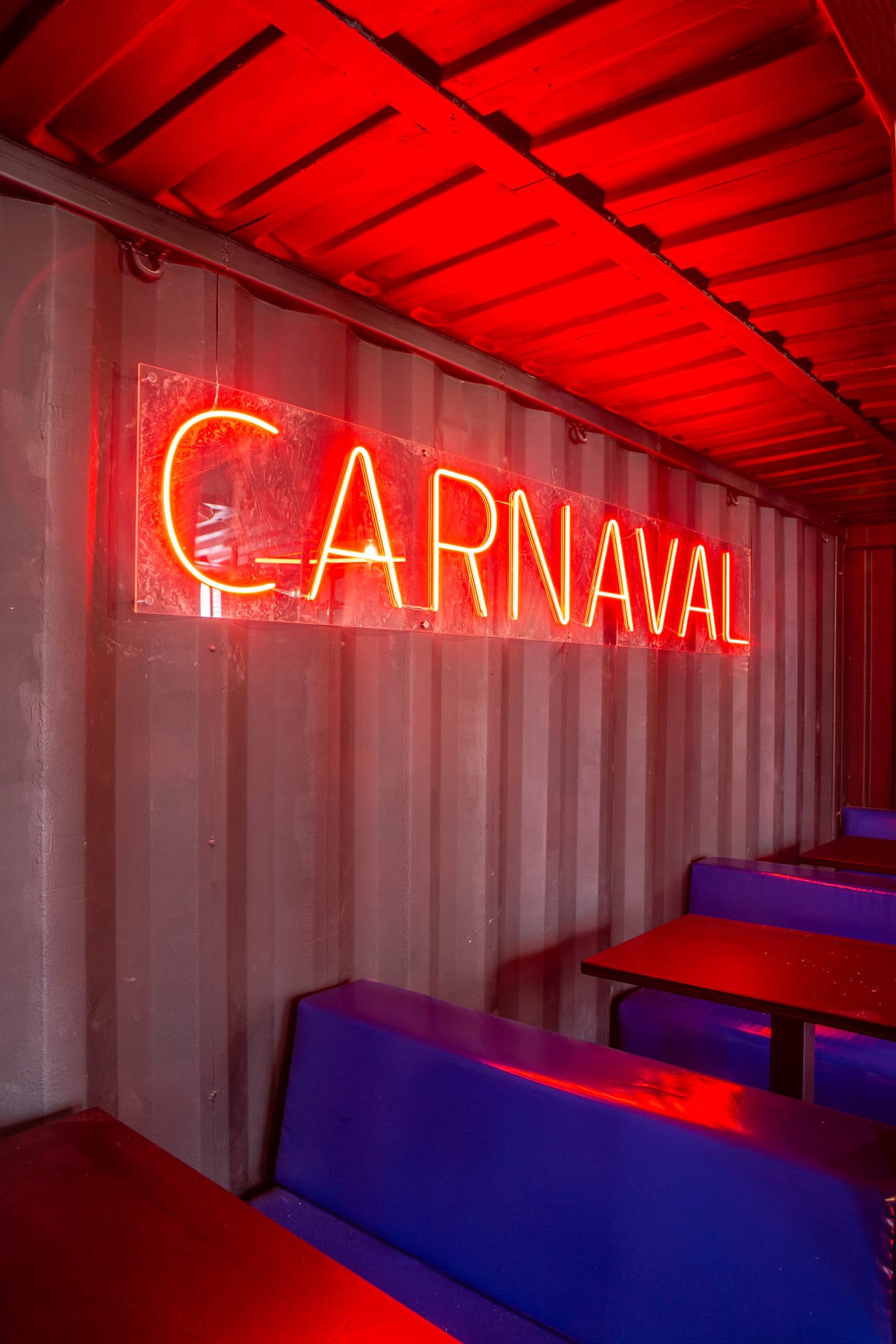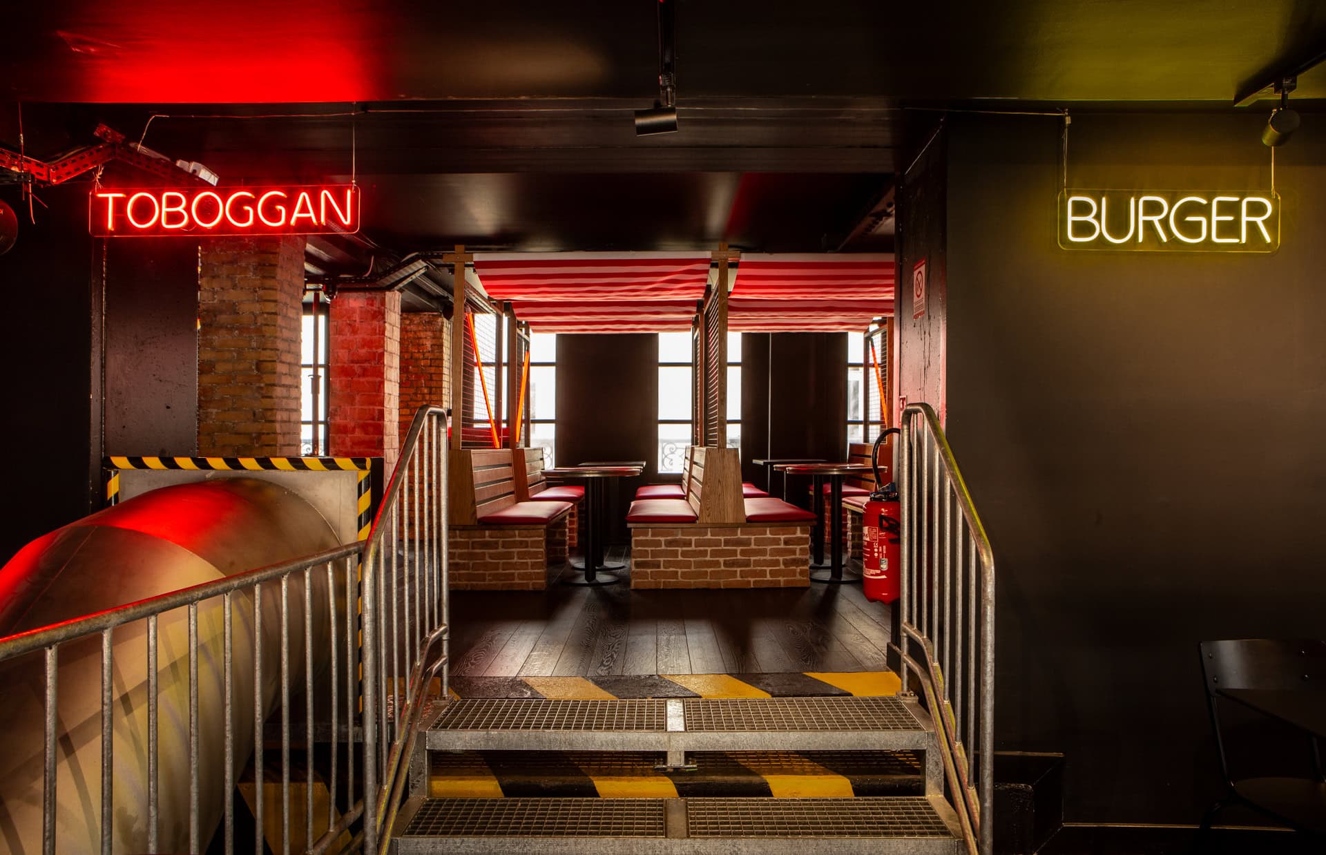 A real bus now houses a table d’hôte for 10 people, a children’s playground slide links the different levels of the restaurant, safety barriers have been converted into railings, and reconditioned and customized containers with red neon lights create intimate boxes for unforgettable meals.