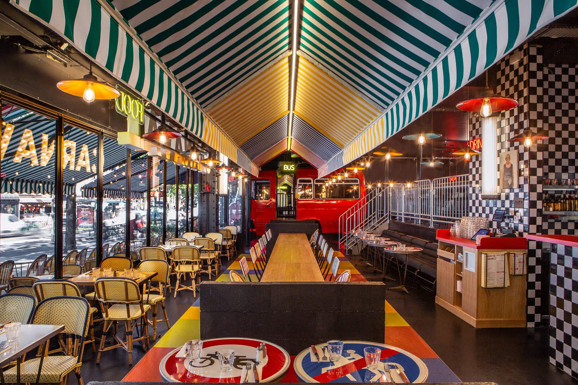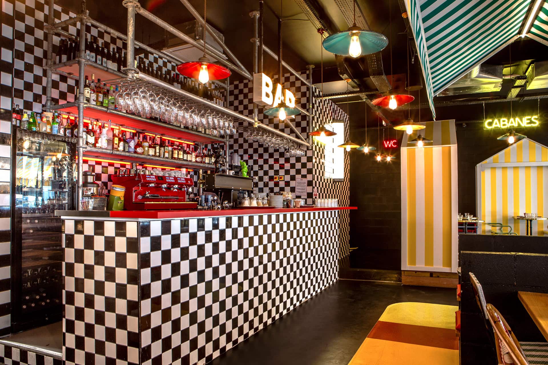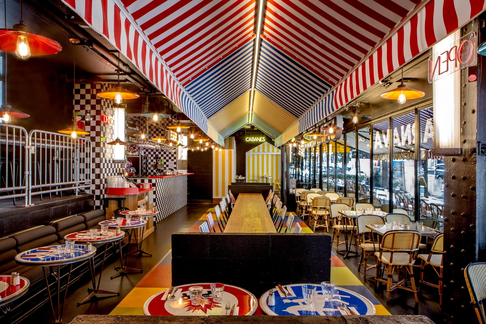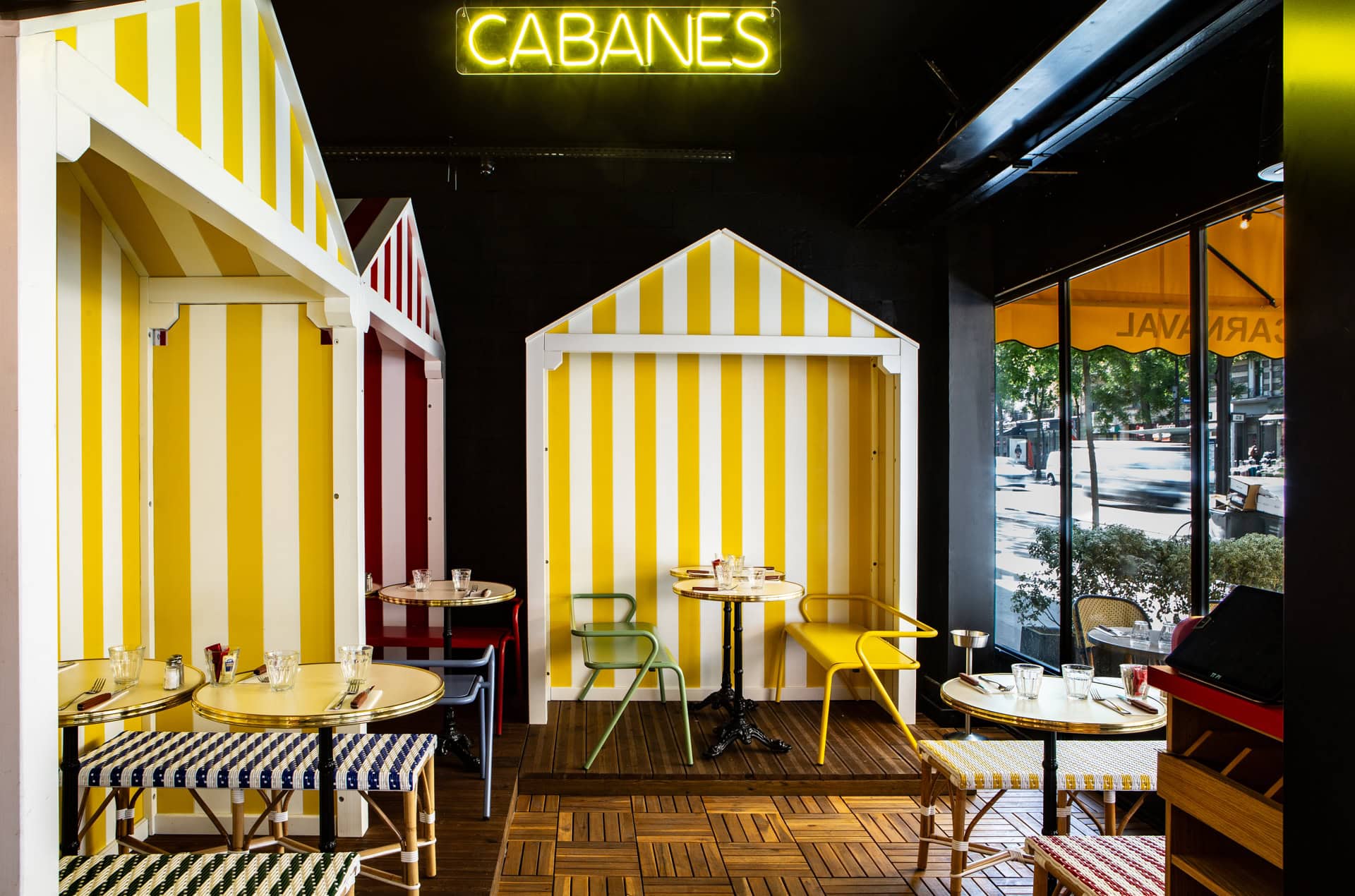 Beach huts on the street front invite you to escape for an aperitif, road signs become table tops, and scaffolding structures are transformed into a bar canopy!