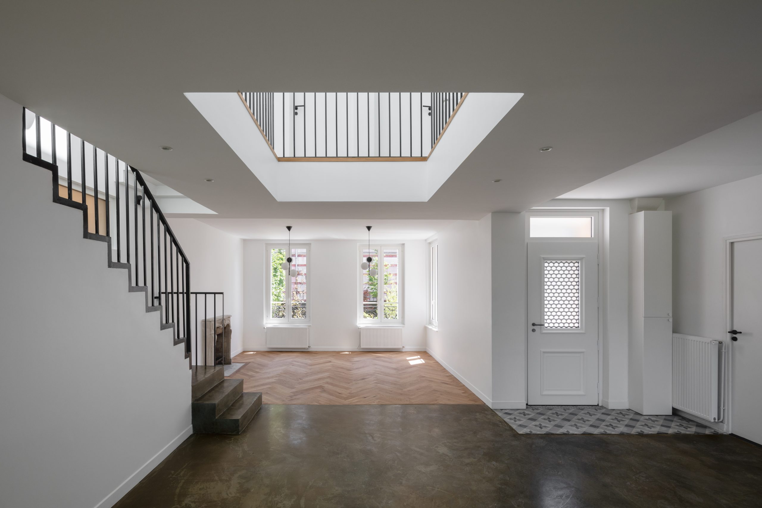 At the heart of the home, a double-height central volume brings natural light into every level. The ground floor hosts an open-plan kitchen, dining room, and living area. A concrete staircase rises to a mezzanine bathed in daylight beneath a large skylight, organizing access to the bedrooms. The basement was excavated to increase ceiling height, allowing for the creation of guest quarters and a home cinema.