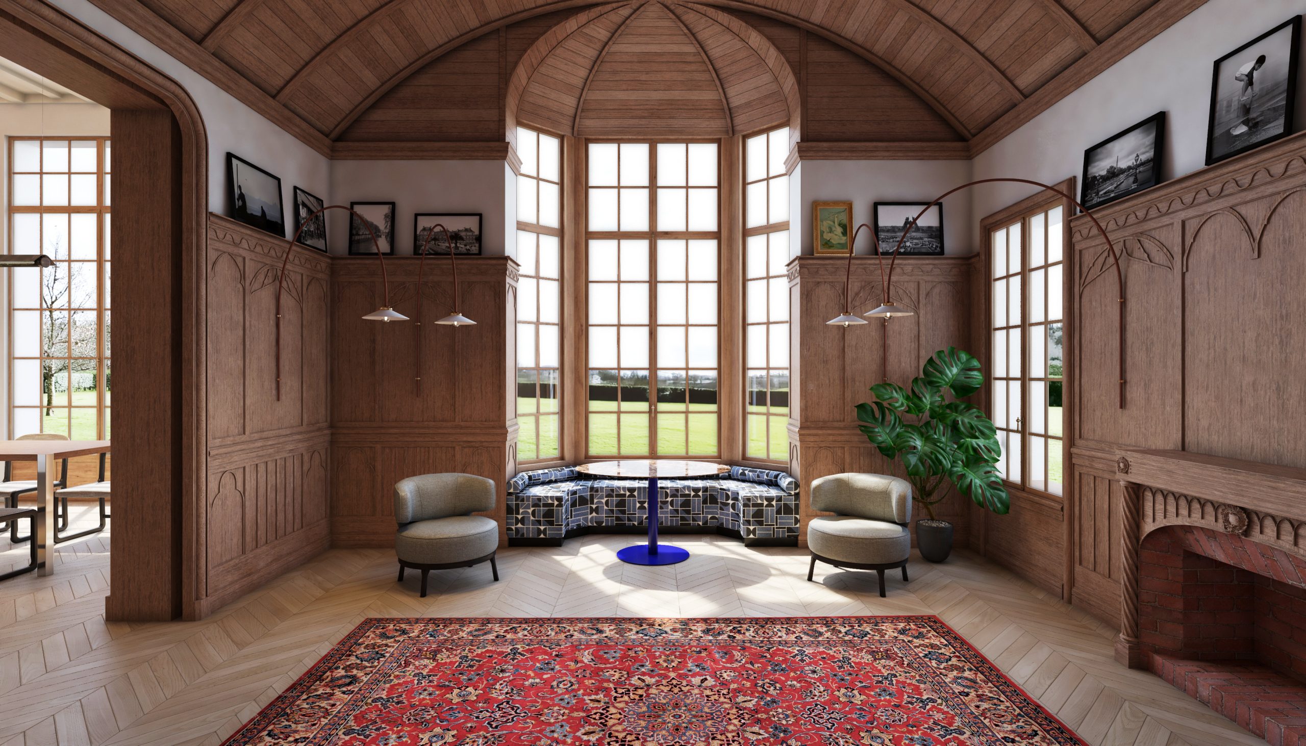 The manor, a distinguished example of early 20th-century Anglo-Norman architecture, spans four floors plus an attic beneath a multi-tiered roof adorned with turrets, dormers, and intricate detailing. The renovation reconfigures the reception areas, introducing a spacious, contemporary open-plan kitchen within the main living room, framed by original century-old woodwork. The basement is completely transformed to include a private cinema and a wine cellar. On the first floor, the original three bedrooms are redesigned into a large primary suite with a walk-in closet and a home office, while the attic is converted into a games room beneath the exposed roof beams.