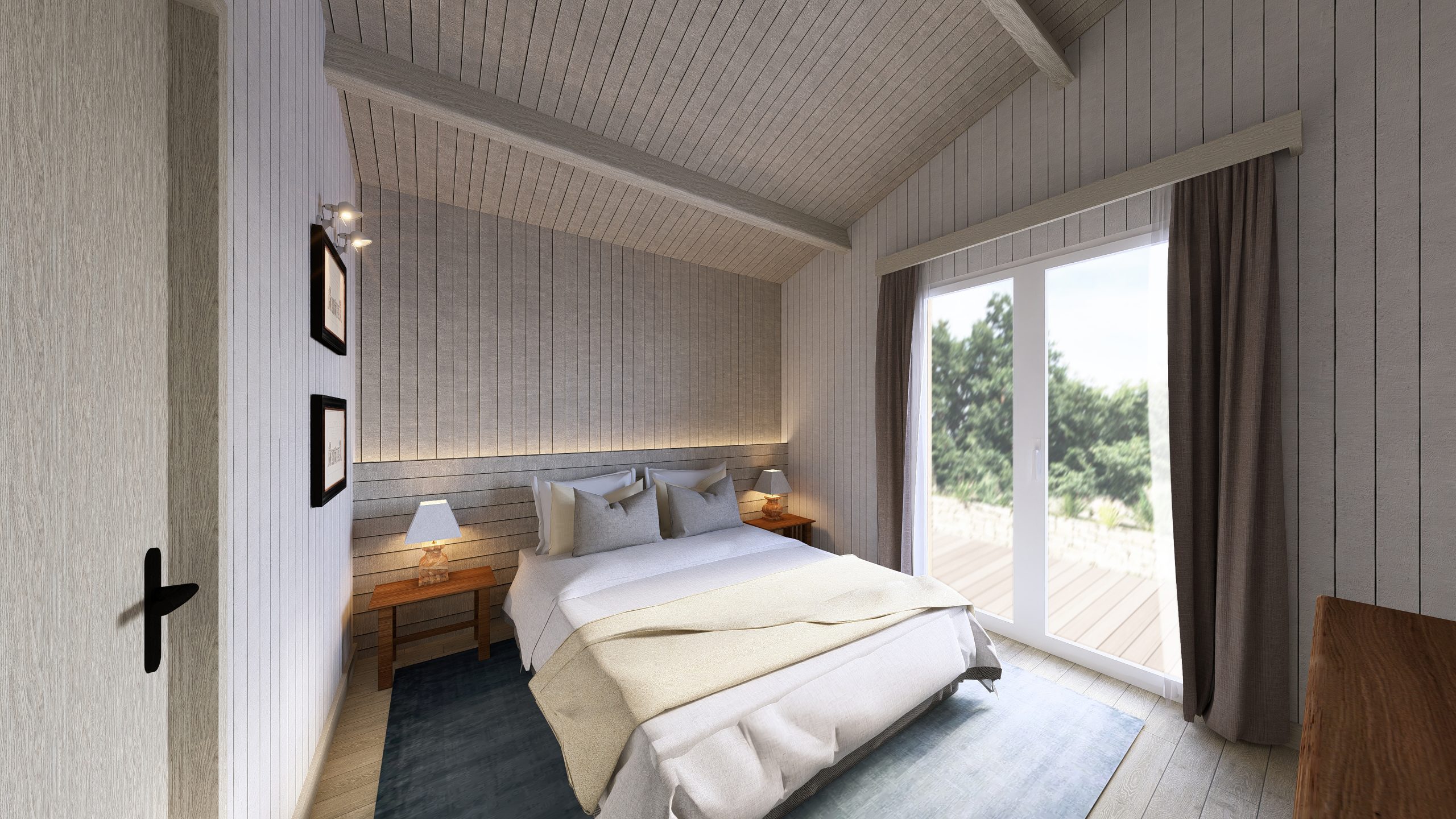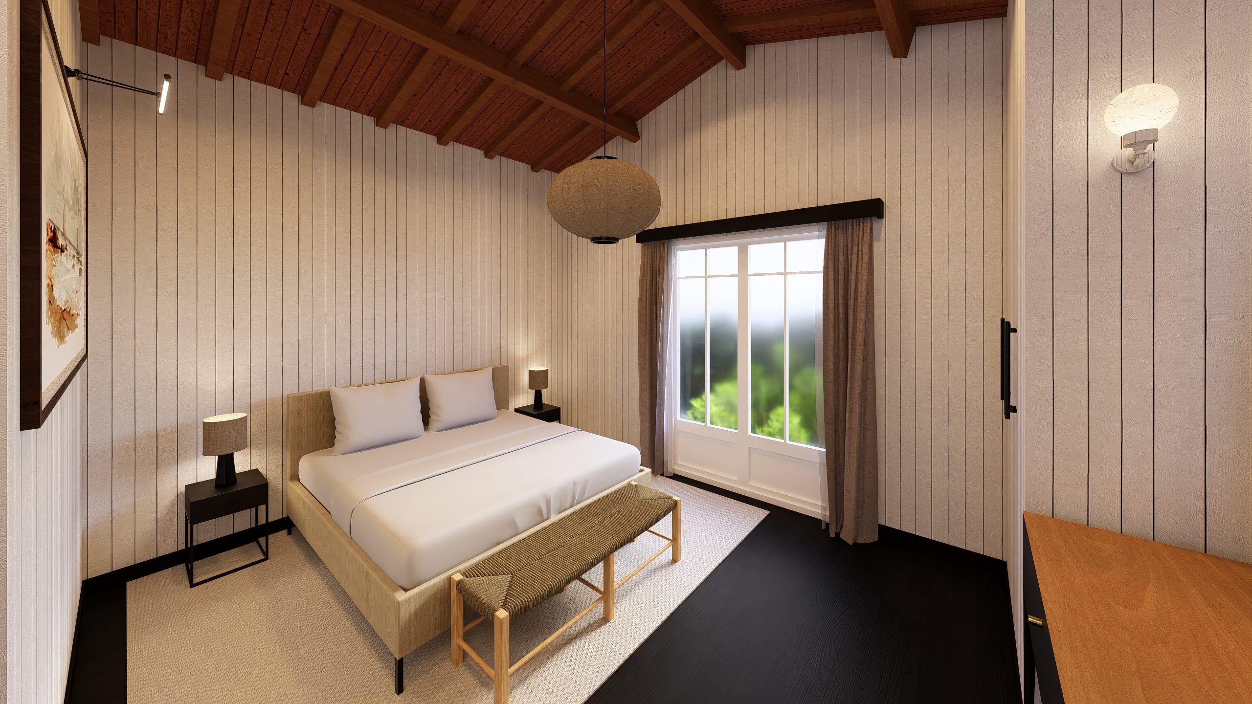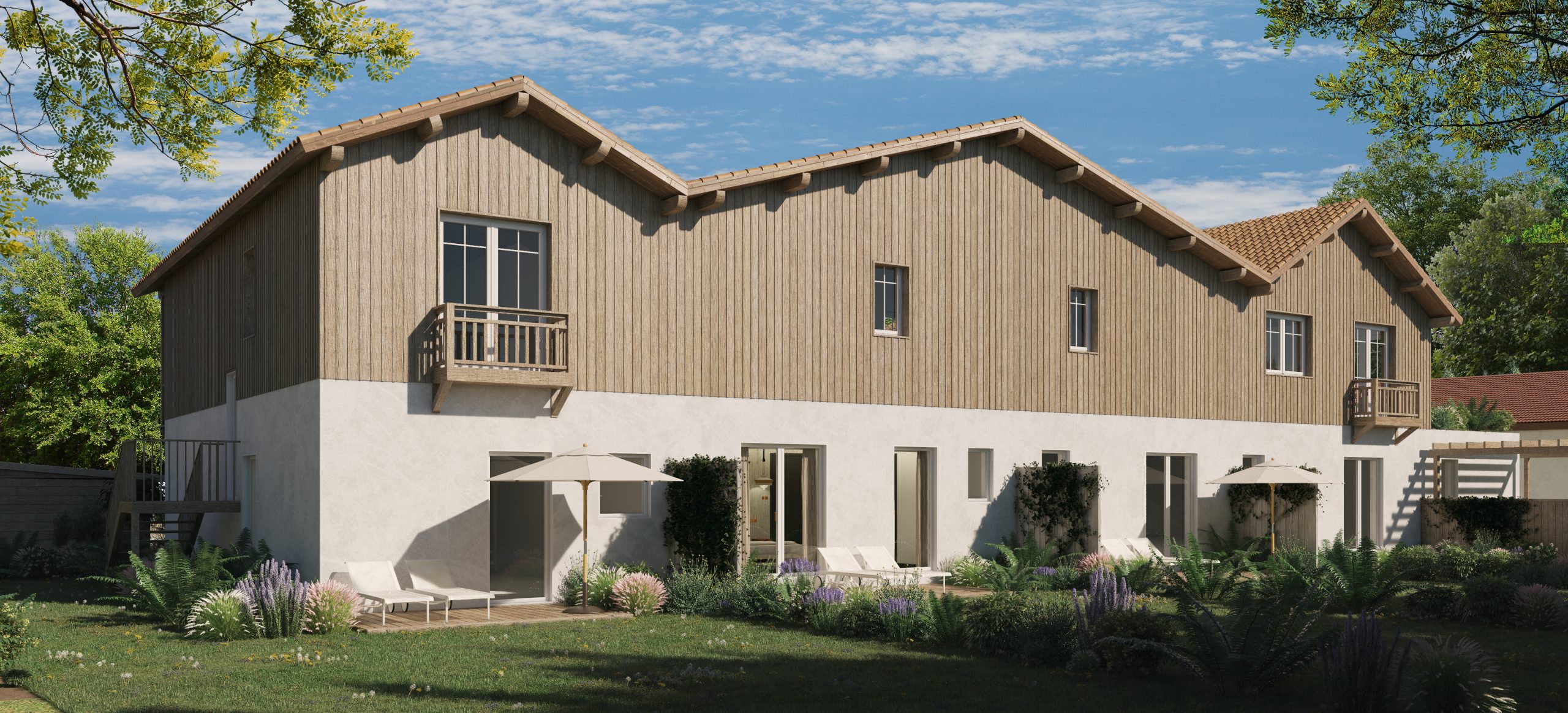 Côté rue, le bâtiment est remanié pour présenter trois volumes, un large volume central en retrait flanqué de deux volumes symétriques. Le rez-de-chaussée et couvert d’un enduit blanc, tandis que l’étage se pare d’un bardage en bois qui faire écho à la charpente de la toiture. De larges balcons viennent agrémenter l’étage. À l’arrière, la façade, plus sobre est complétée par des terrasses privatives en rez-de-jardin.