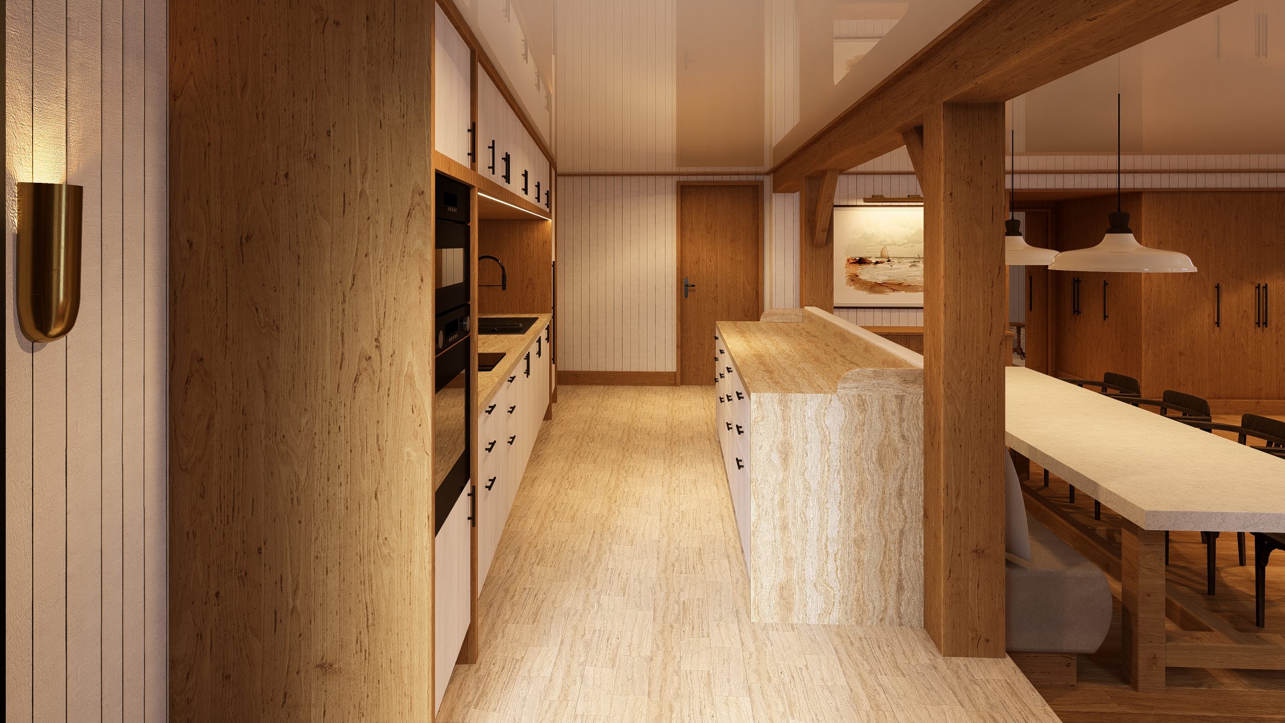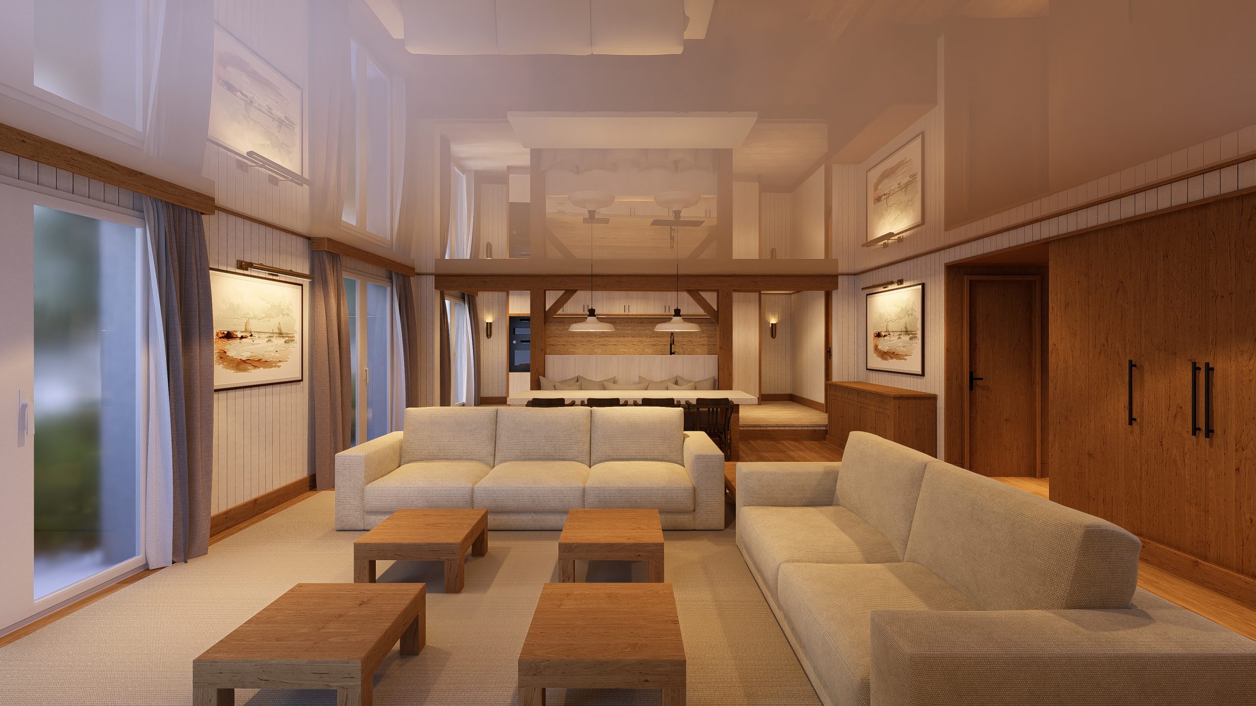Trois appartements, de type trois, quatre et cinq pièces, s’organisent autour d’un hall d’accueil. Le cinq pièces, en duplex, occupe toute l’aile ouest du bâtiment, tandis que les quatre pièces se développe en rez-de-jardin et le trois pièces occupe l’étage.
