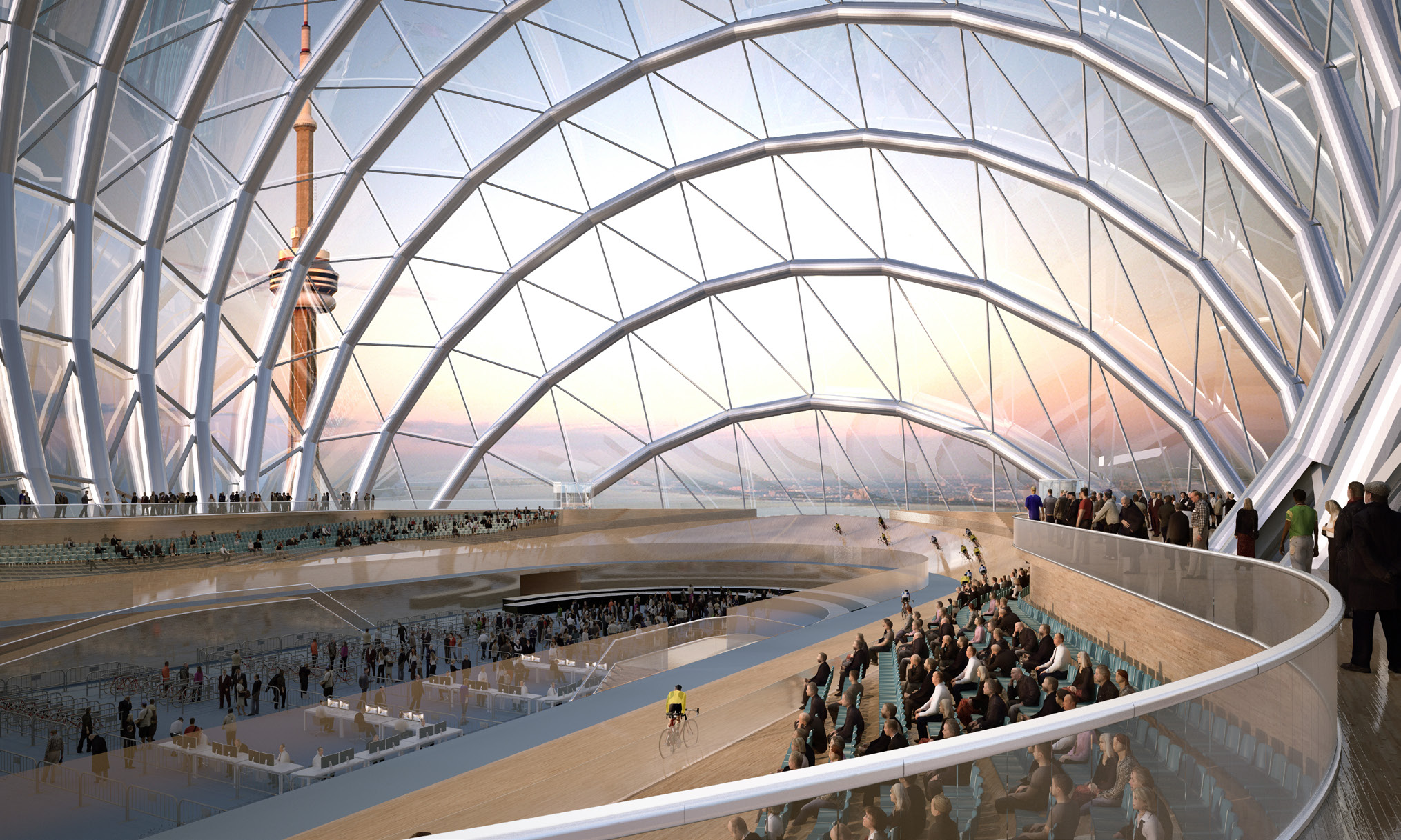 Véritable promontoire, cet objet multifonctions offre des vues remarquables et inconnues à ce jour pour un vélodrome, un hôtel, des bureaux ou des commerces à Toronto. La piste du vélodrome devient un lieu unique ou performances et panoramas ne font qu’un sous le dôme de verre culminant à 300m.