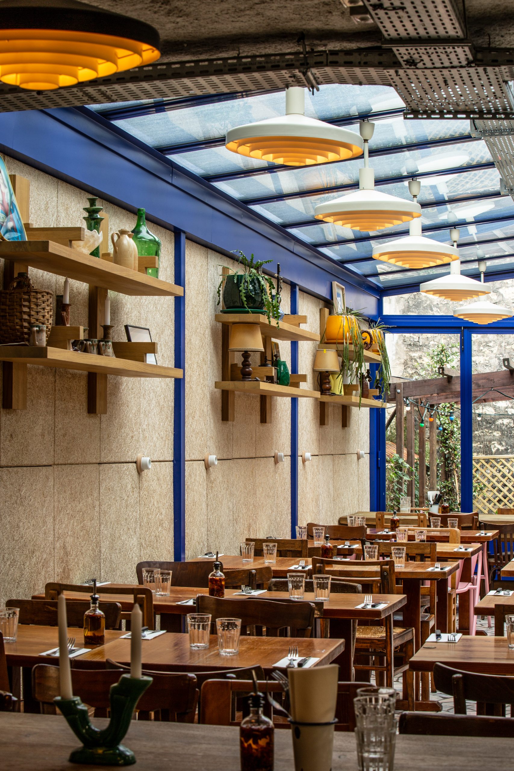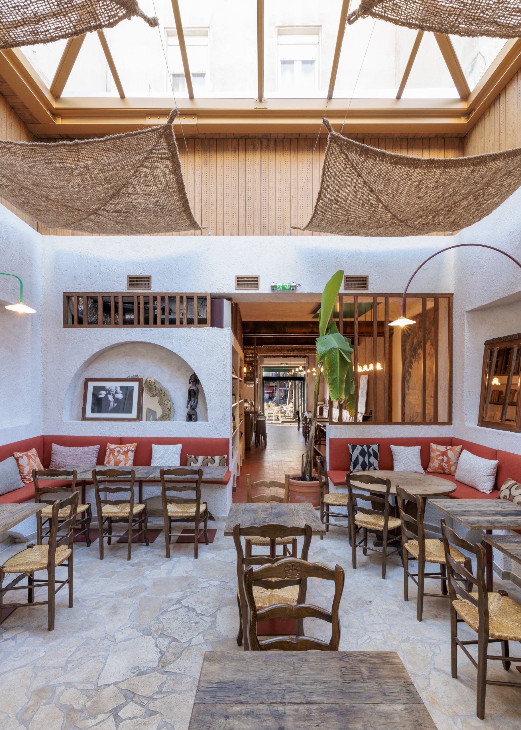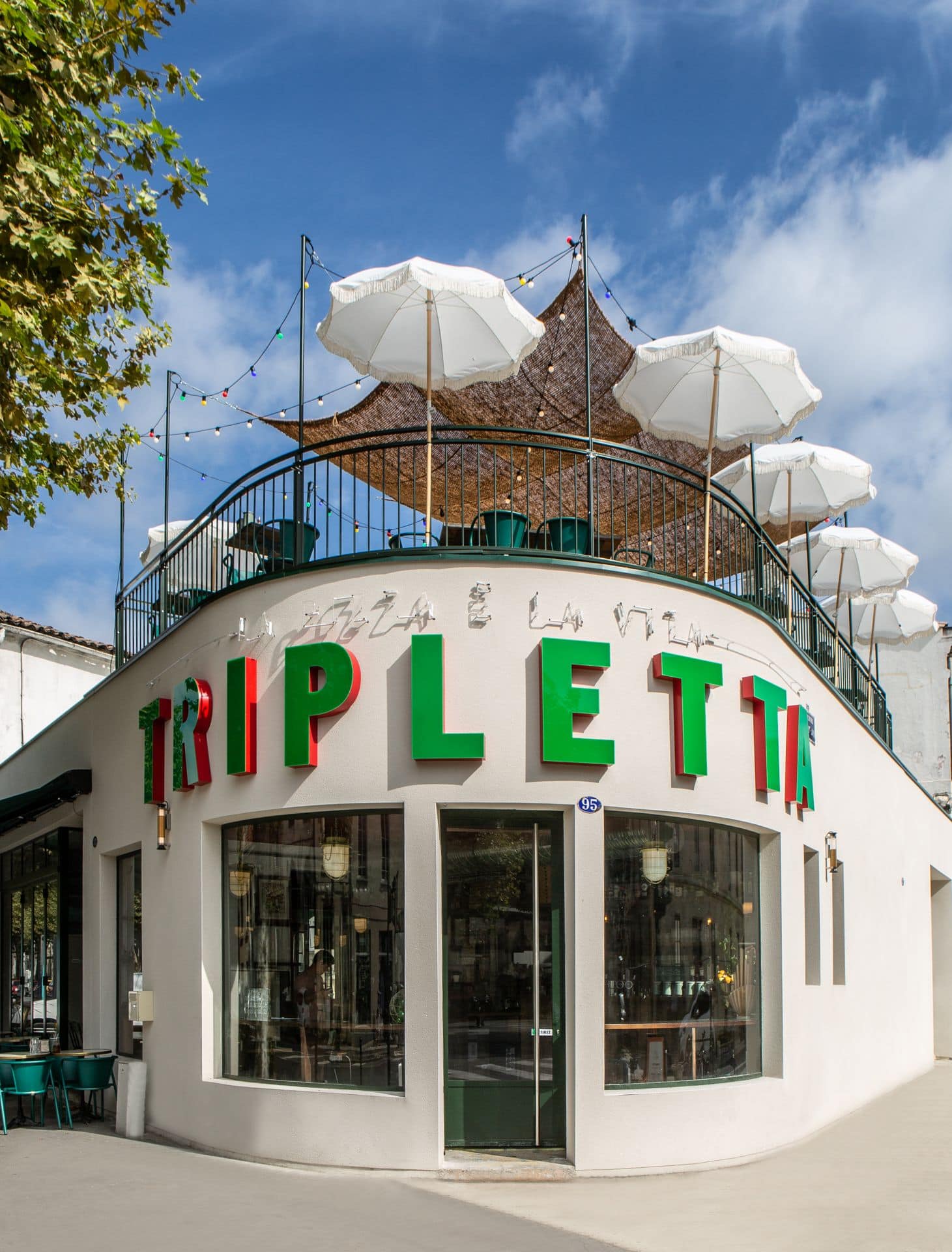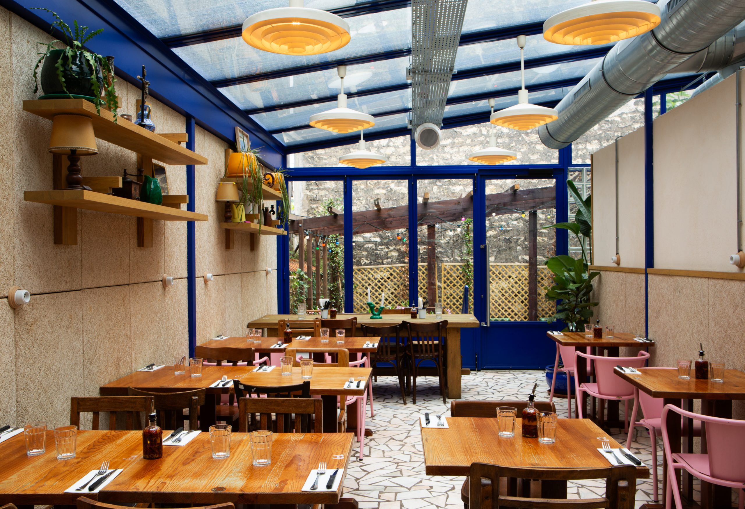 Tripletta s’encanaille, un bleu vibrant recouvre la vaste verrière du local, les chaises sont roses, une grille jaune sépare le bar de l’entrée. A Marseille, un patio méditerranéen est créé, avec des murs blanchis à a chaux, sous des parasols en fibre naturelle. L’ensemble, hétérogène et vivant, forme néanmoins une unité cohérente.