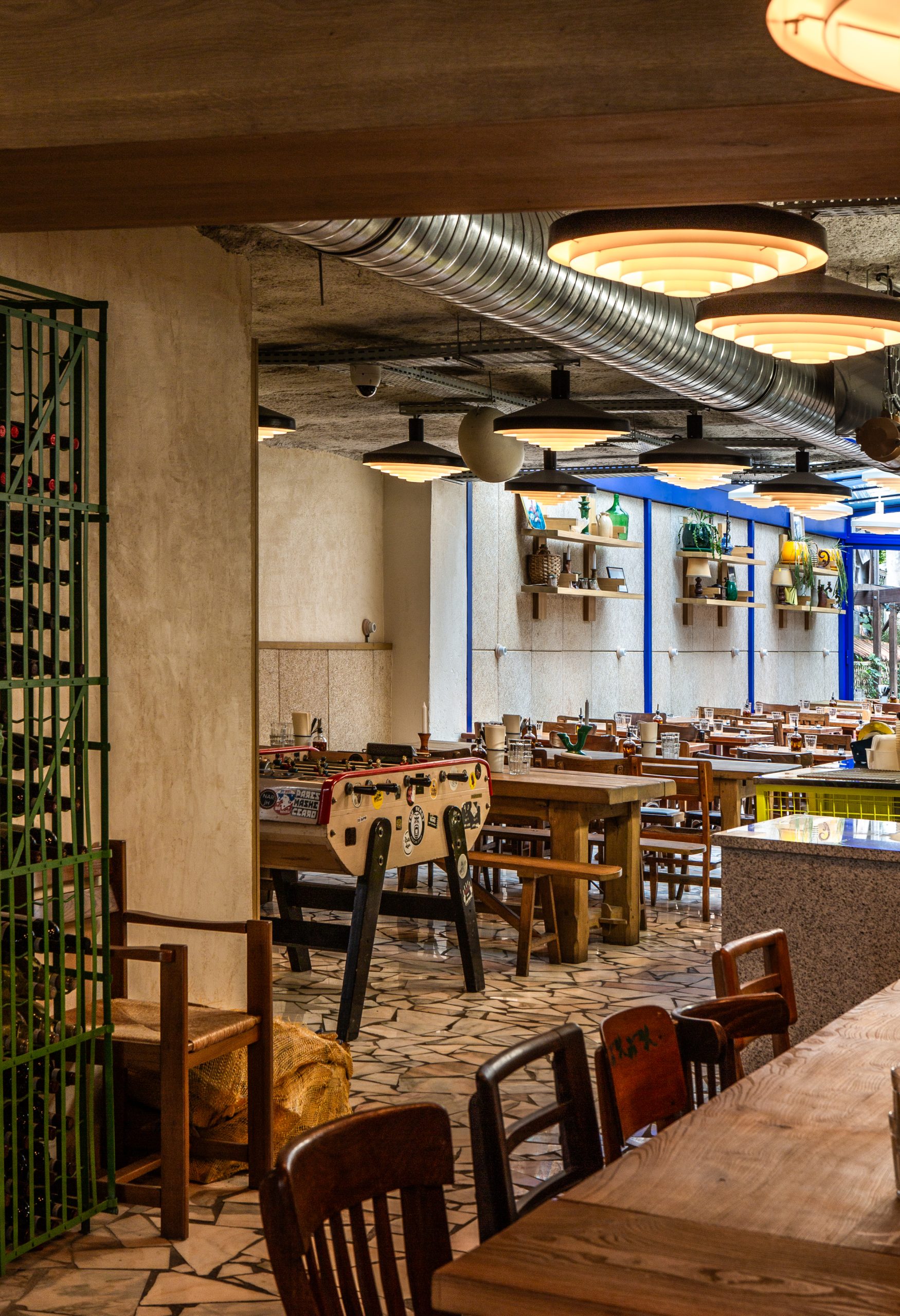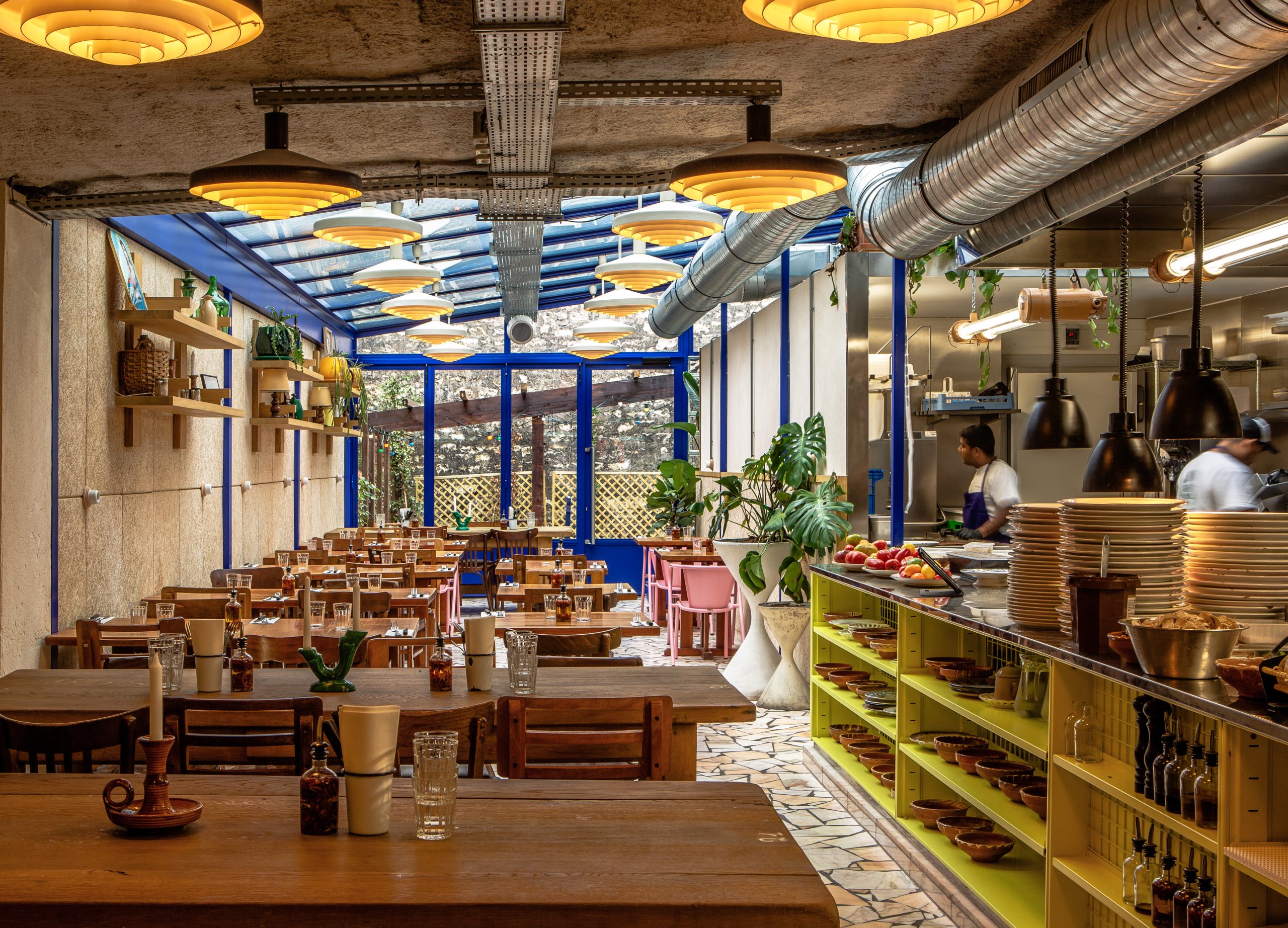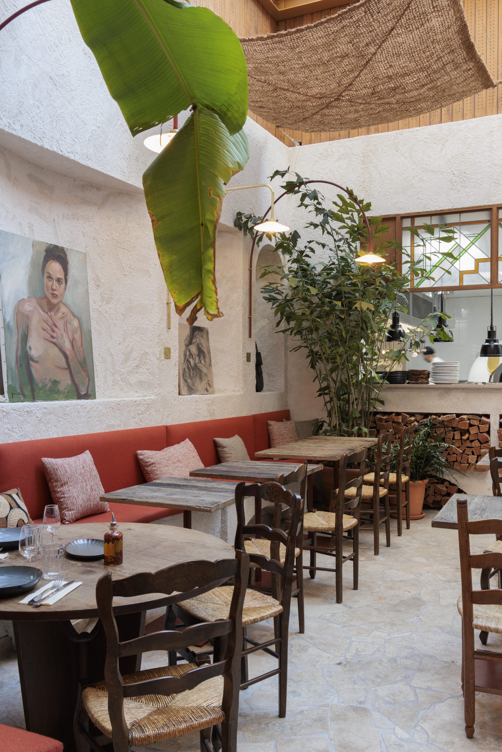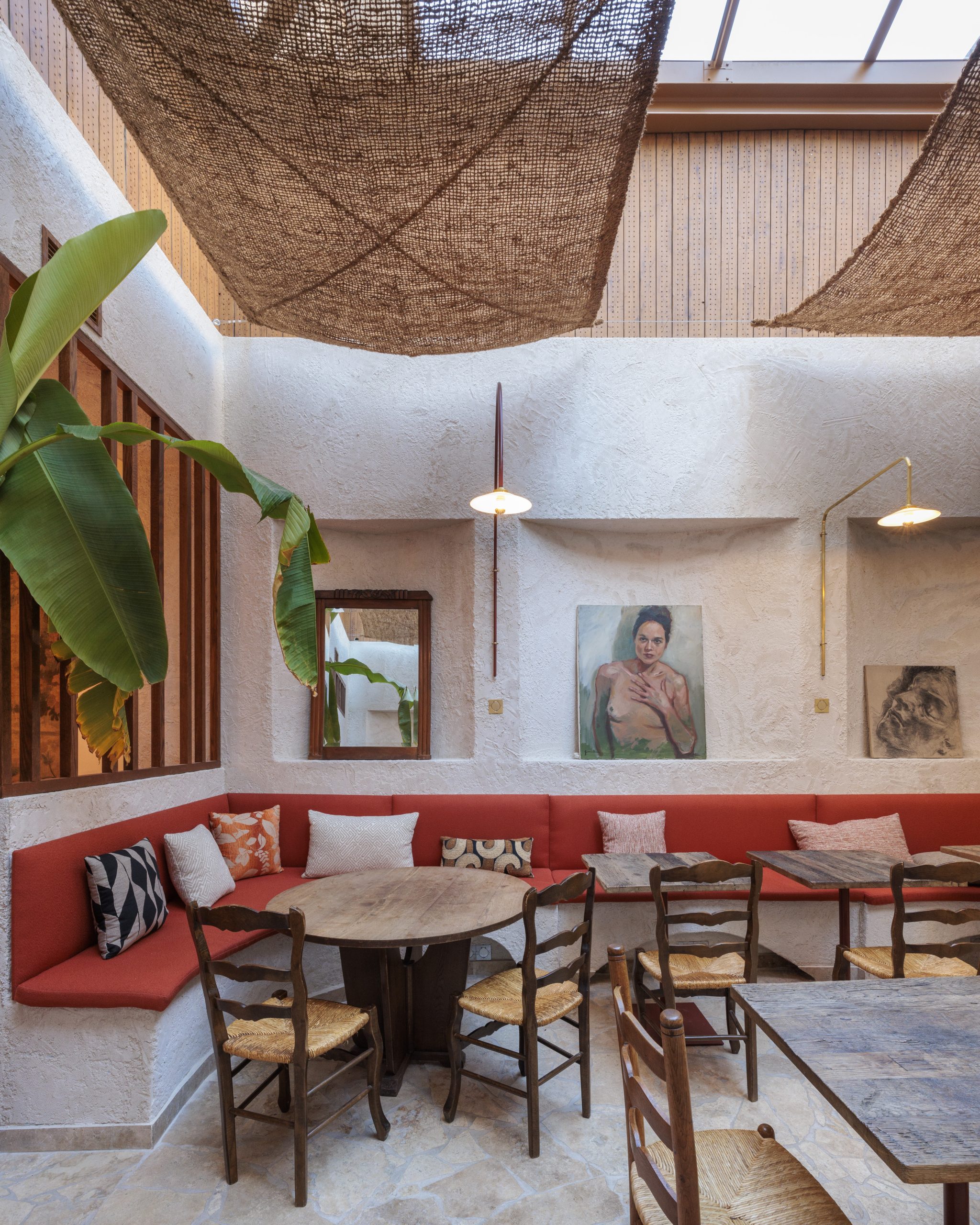 Tripletta s’encanaille, un bleu vibrant recouvre la vaste verrière du local, les chaises sont roses, une grille jaune sépare le bar de l’entrée. A Marseille, un patio méditerranéen est créé, avec des murs blanchis à a chaux, sous des parasols en fibre naturelle. L’ensemble, hétérogène et vivant, forme néanmoins une unité cohérente.