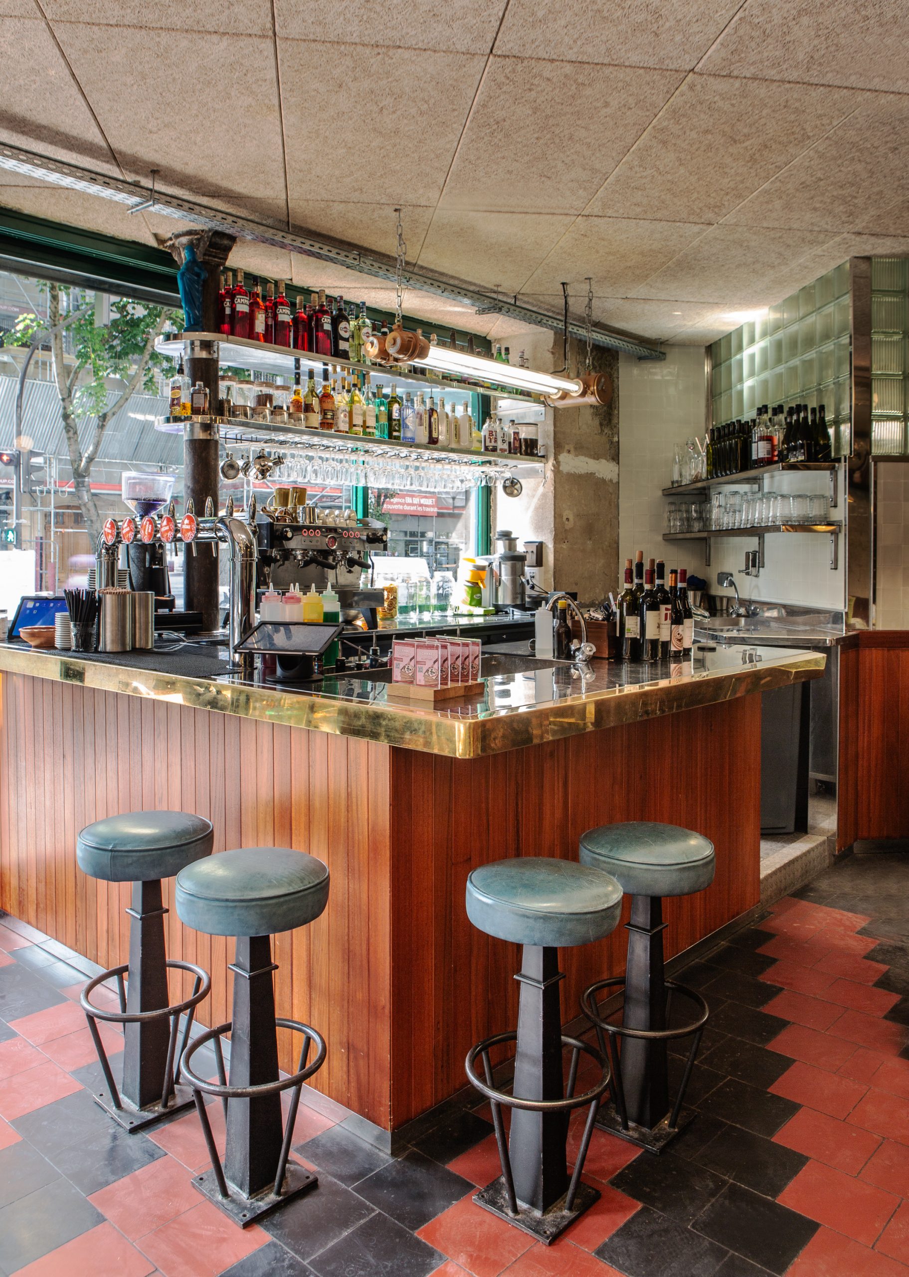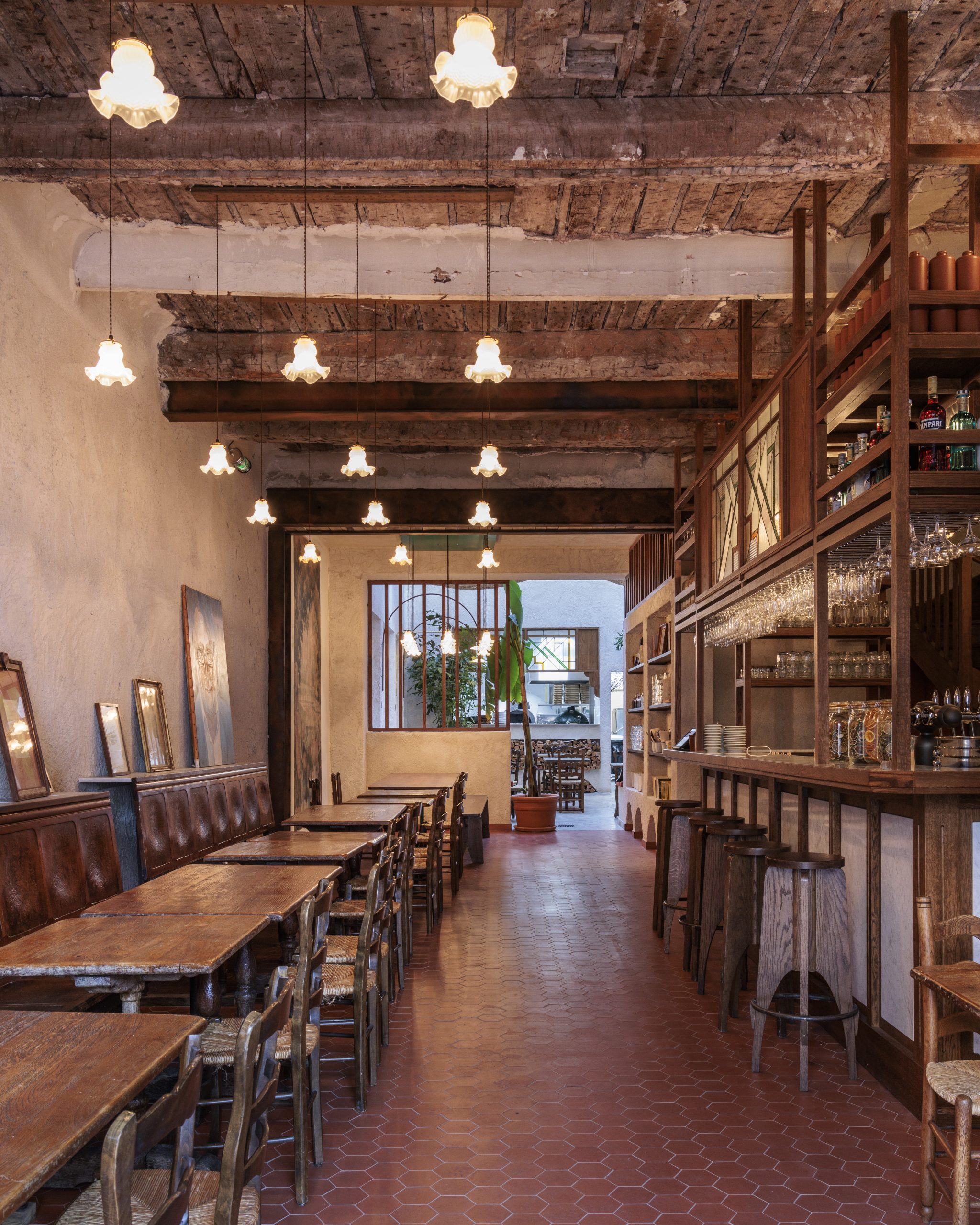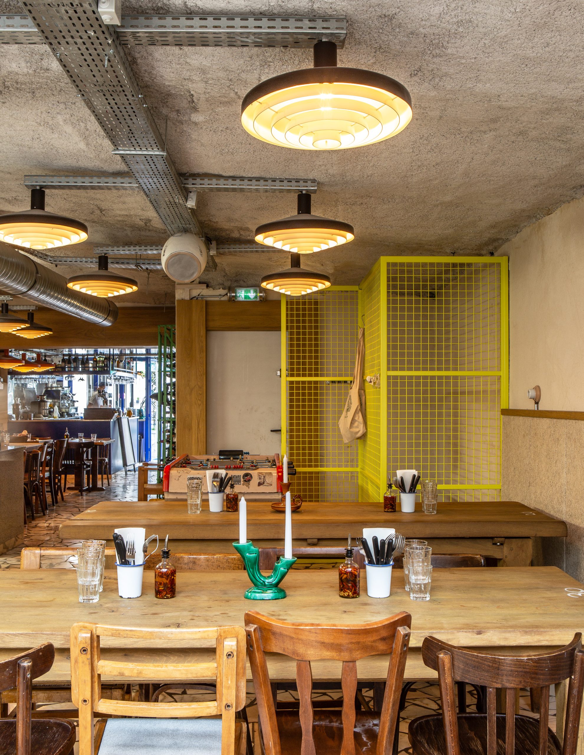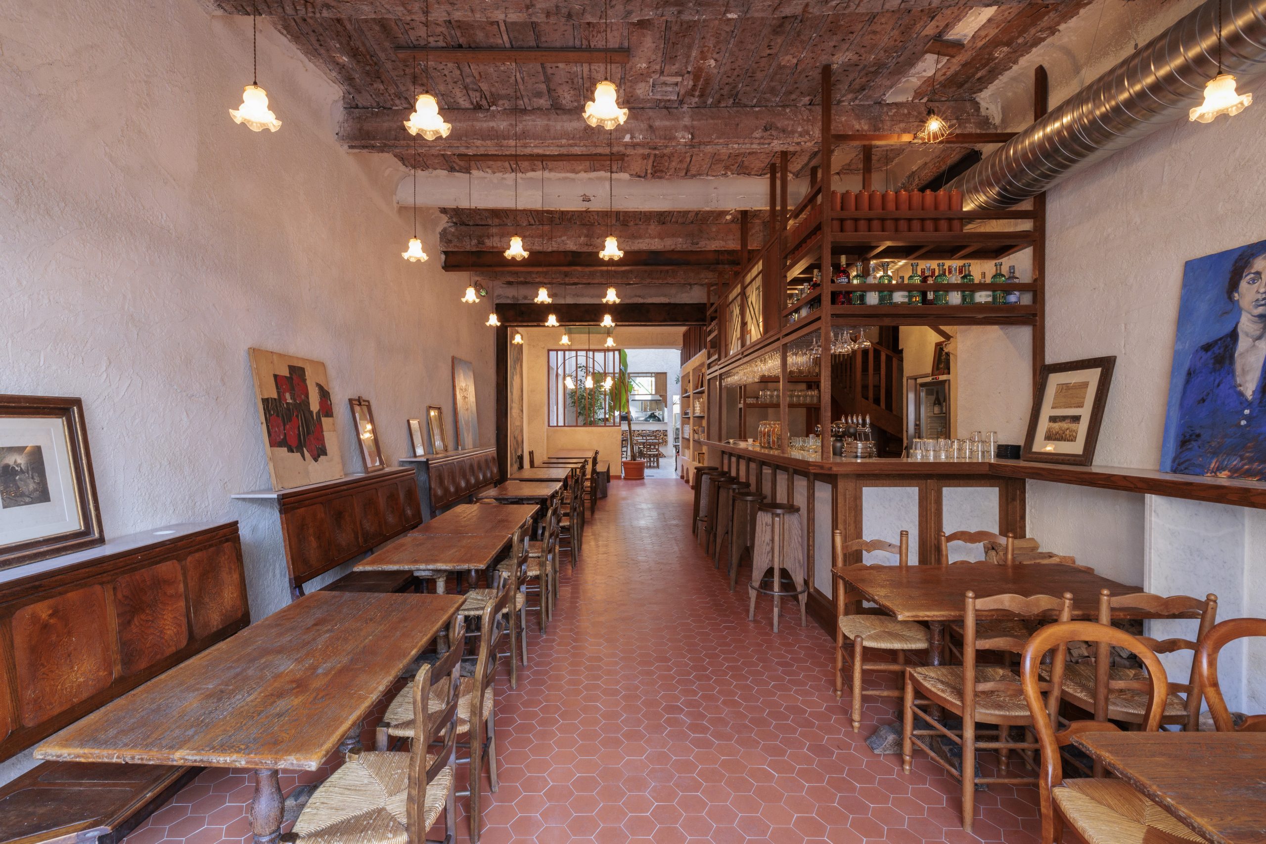Tripletta s’encanaille, un bleu vibrant recouvre la vaste verrière du local, les chaises sont roses, une grille jaune sépare le bar de l’entrée. A Marseille, un patio méditerranéen est créé, avec des murs blanchis à a chaux, sous des parasols en fibre naturelle. L’ensemble, hétérogène et vivant, forme néanmoins une unité cohérente.