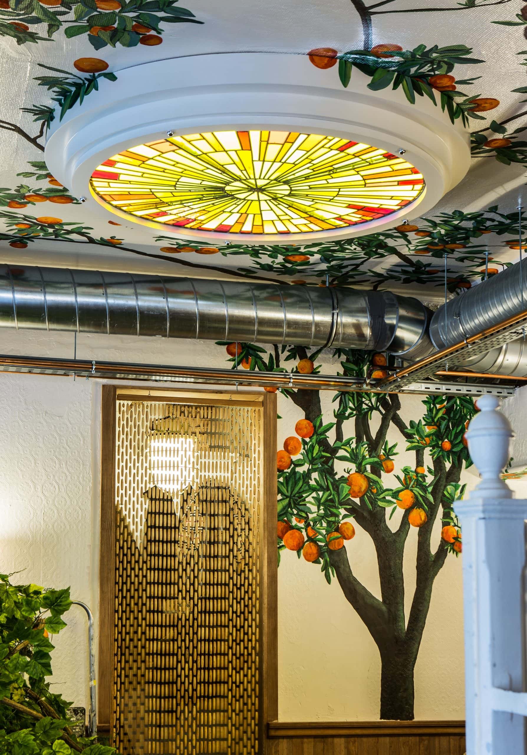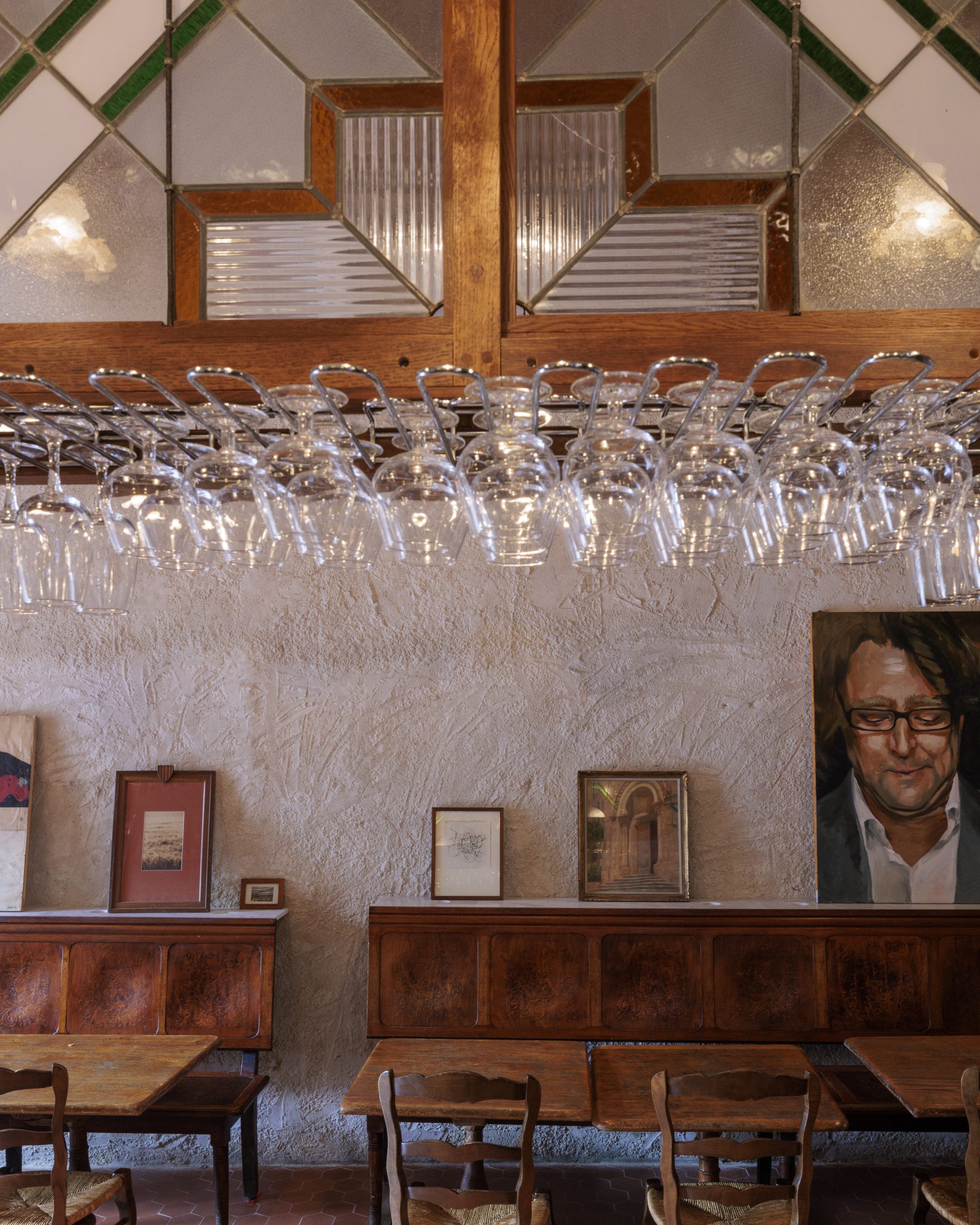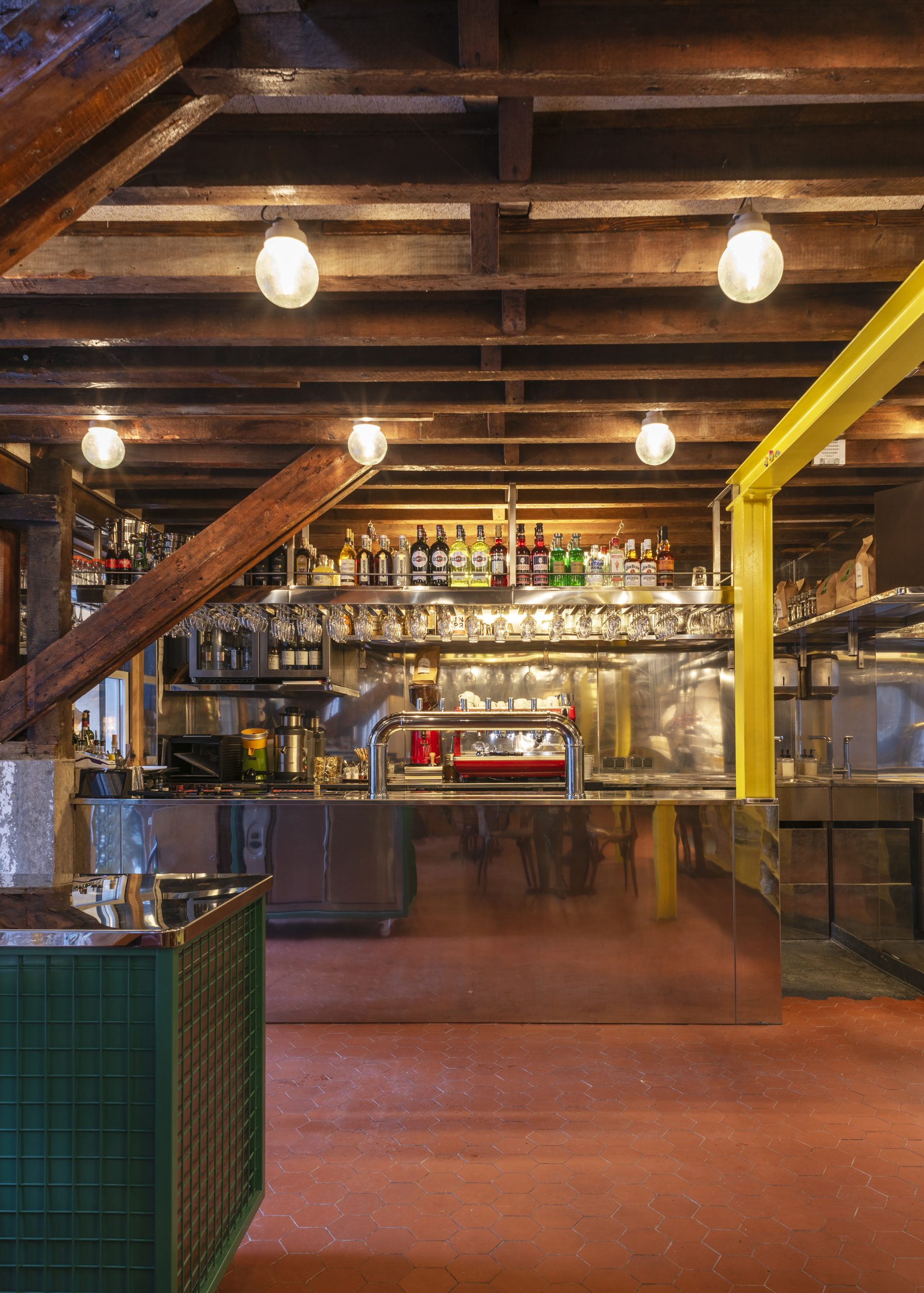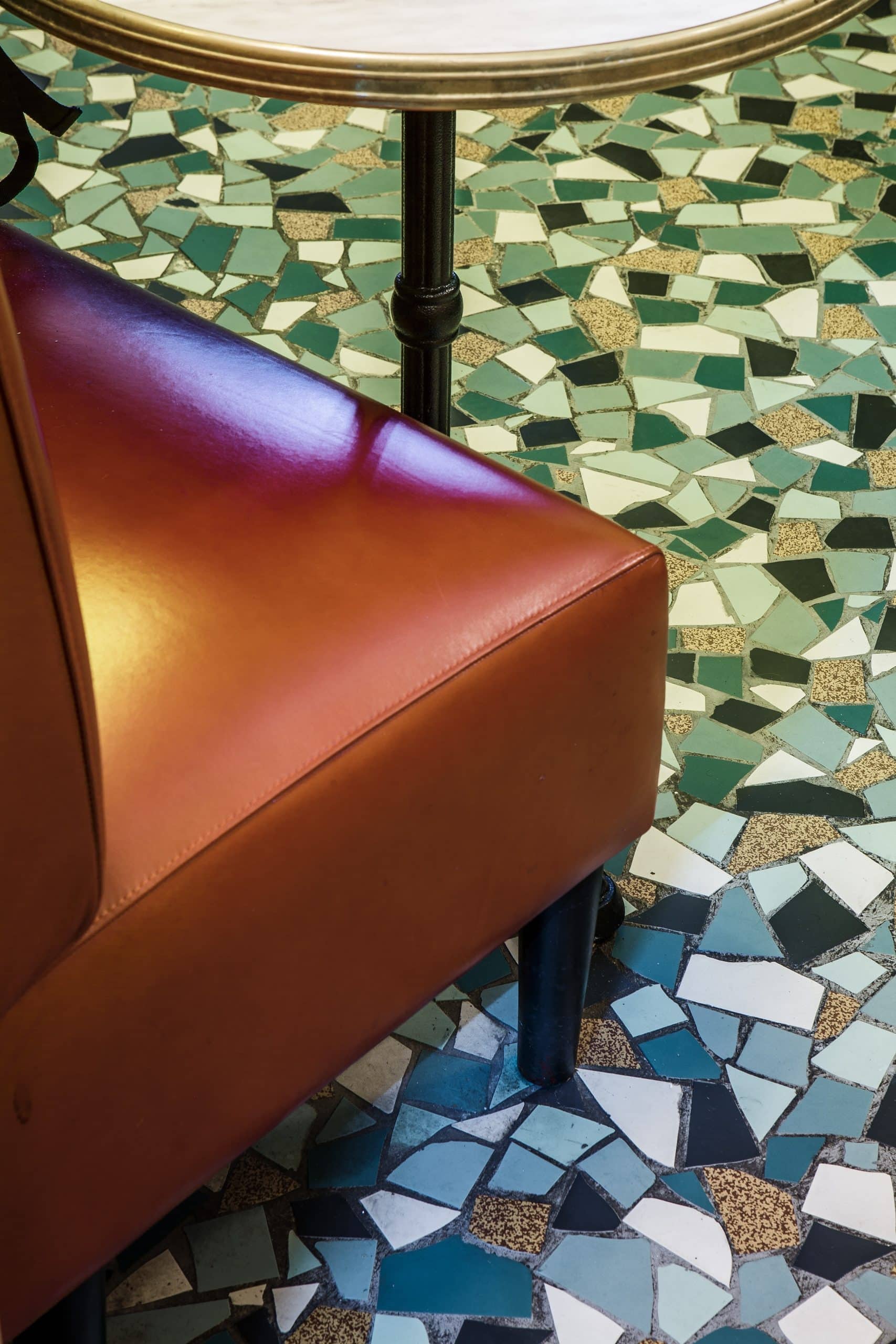 Tripletta s’encanaille, un bleu vibrant recouvre la vaste verrière du local, les chaises sont roses, une grille jaune sépare le bar de l’entrée. A Marseille, un patio méditerranéen est créé, avec des murs blanchis à a chaux, sous des parasols en fibre naturelle. L’ensemble, hétérogène et vivant, forme néanmoins une unité cohérente.