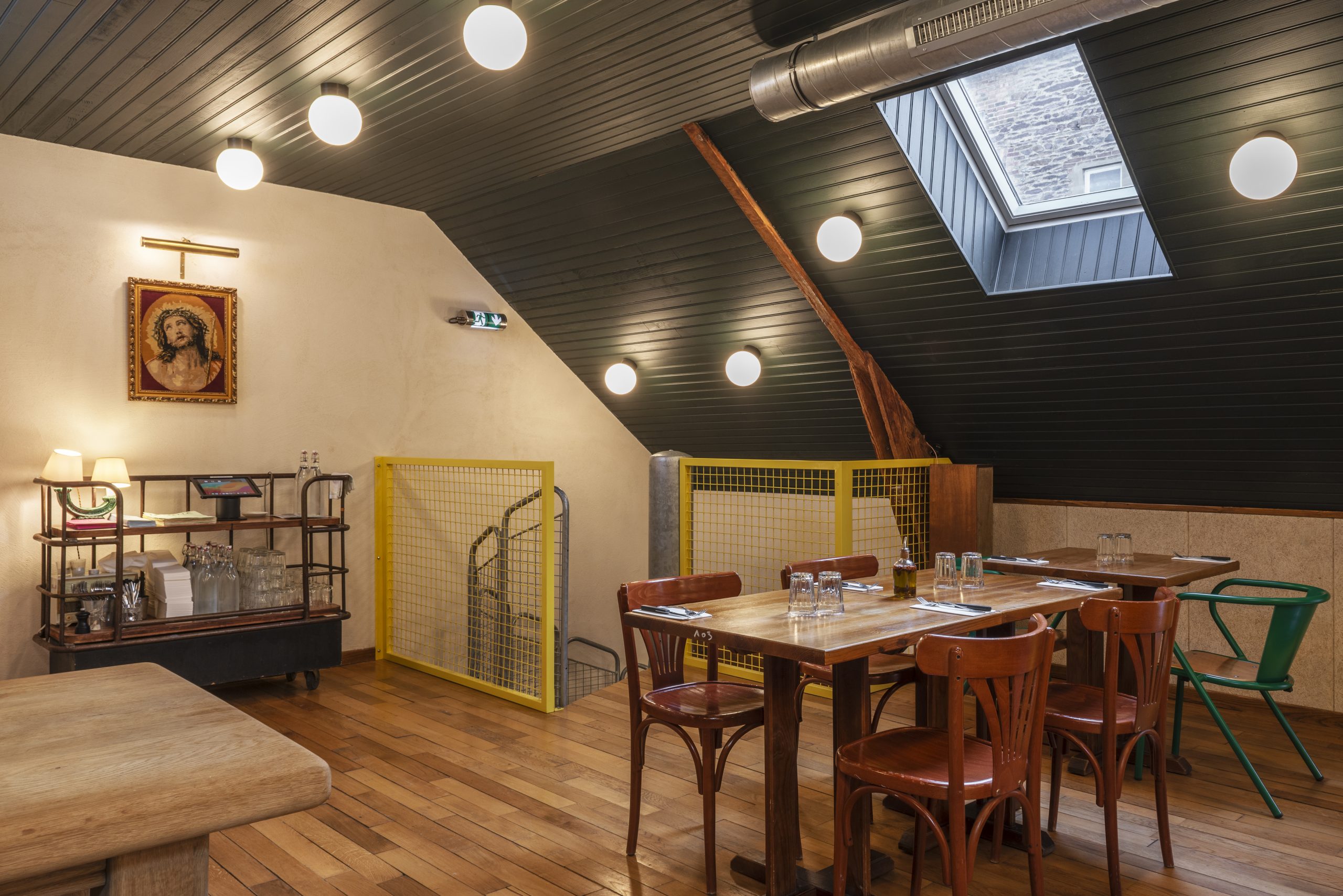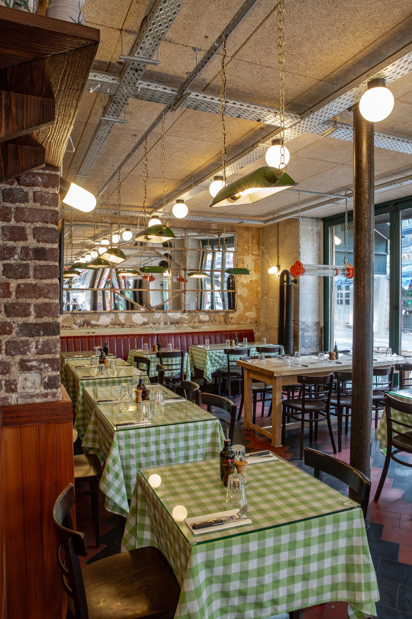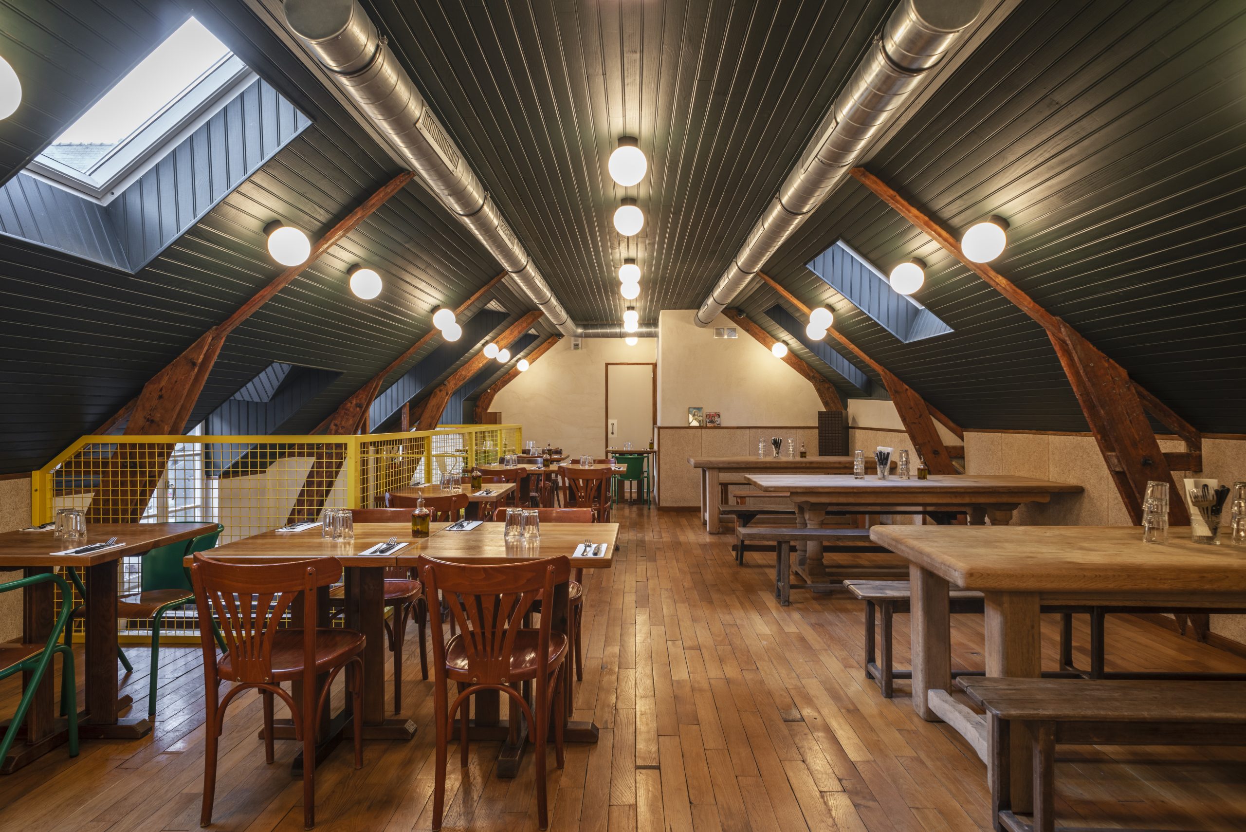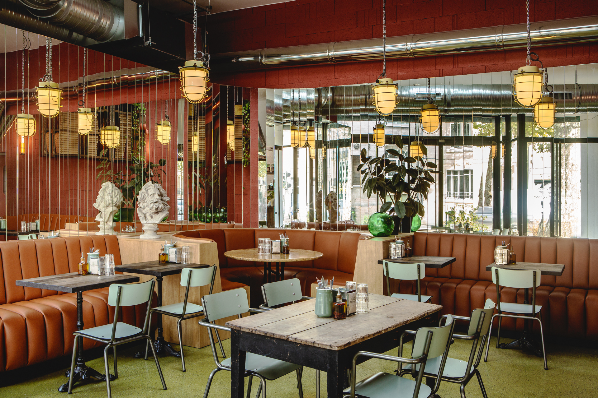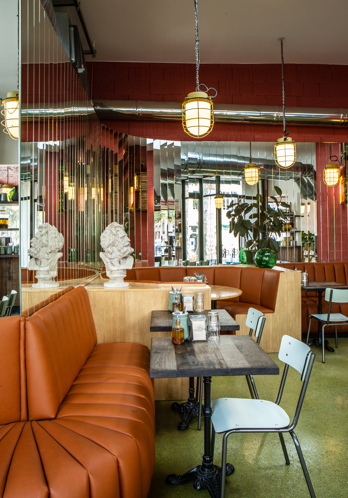 Chaque Tripletta propose une atmosphère unique, liée au local existant, son architecture et ses dimensions, le quartier, la ville. A Versailles, le Tripletta prend place dans un immeuble de pierre de taille et briques, et met l’accent sur des tonalités sobres, de belles matières, et des jeux de lumière avec des pans de miroirs aux murs. A Montrouge, au sud de Paris,