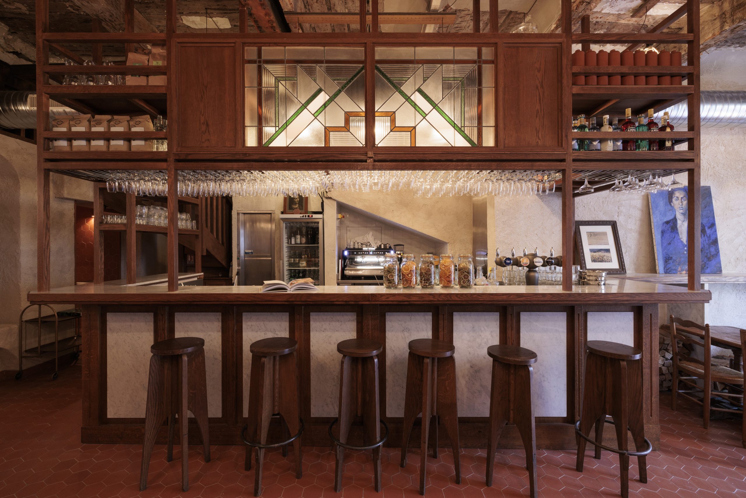 Tommettes, cassons, sculptures, assiettes, mobilier sur mesure, bois de récupération et plantes grasses se retrouvent en salle.